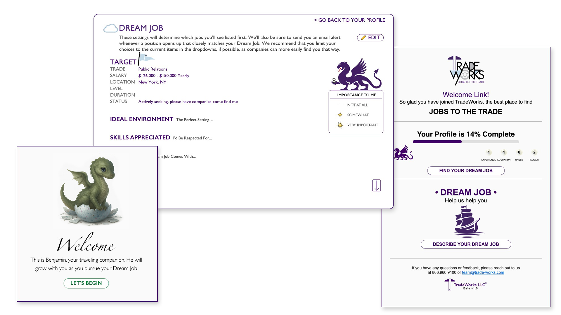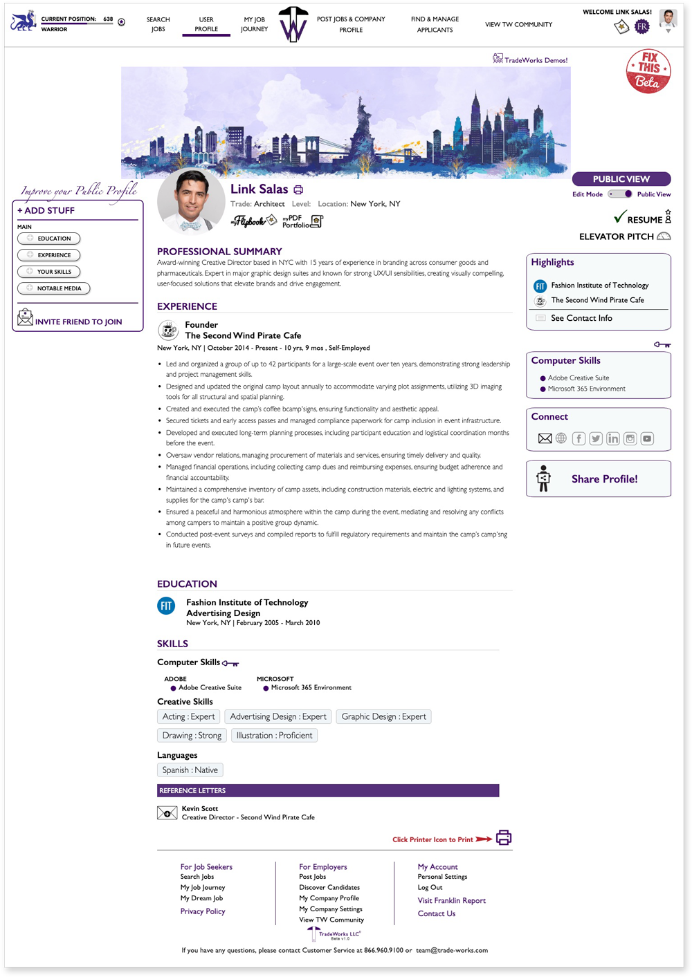 The finished profile layout is clean and easy to edit, with simple tools for adding extra skills, accolades, personal details, and even a video resume. I also included a “Dream Job” section, giving job seekers the chance to define exactly what they’re looking for—whether that’s a certain role, location, or work environment. The goal was to make TradeWorks not just a place to find work, but a place where people can represent themselves fully and connect with the opportunities that fit them best.