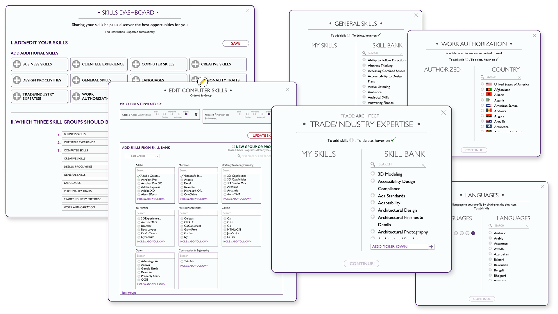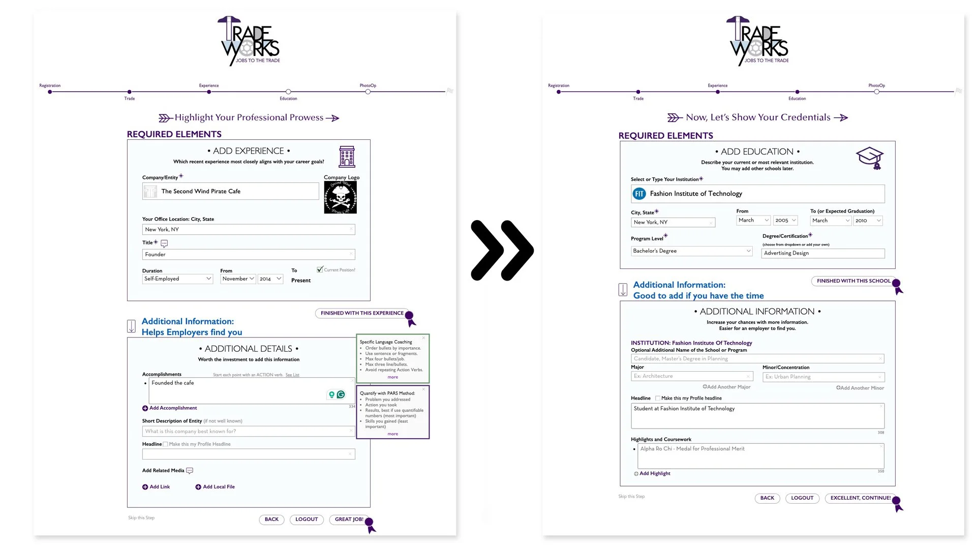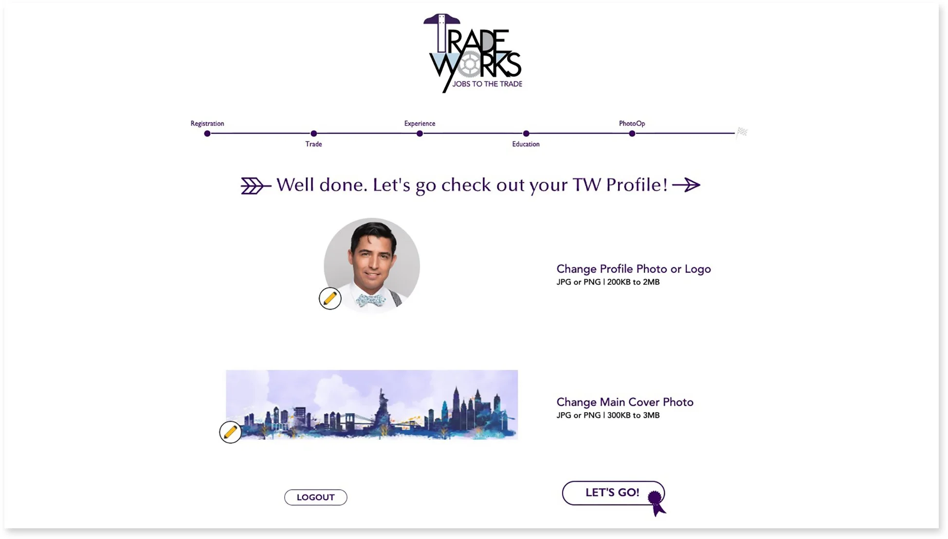Once the basics are in place, I guide users into sharing their story—education, work history, and relevant experience—so employers can get a complete picture of their skills. To make each profile feel more personal, I built a page where users can upload a headshot and a background image. That visual element brings a human touch to the platform.