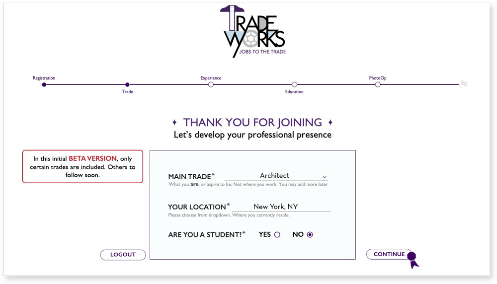 When we designed TradeWorks, I wanted the experience to feel clear and approachable from the very first click. The home screen is split into two paths—one for job seekers and one for employers—so people know exactly where to start. From there, the profile setup begins with just the essentials: a user’s main trade and location. This step instantly helps match them with the right kinds of opportunities.